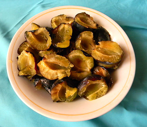 Начните с того, что аккуратно извлеките косточки из слив.