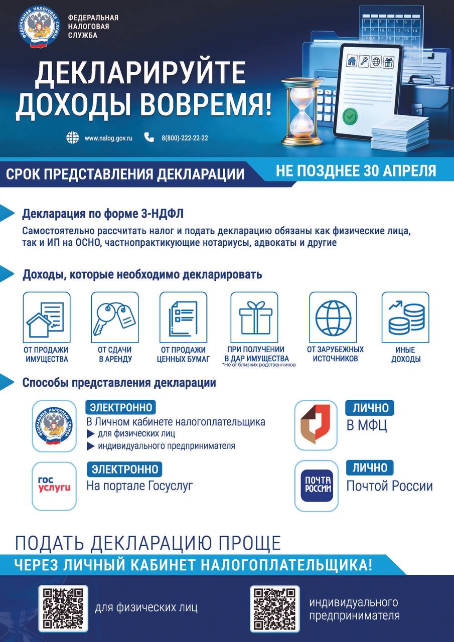 Представить декларацию о доходах, полученных в 2025 году, необходимо до 30 апреля 2026 года.