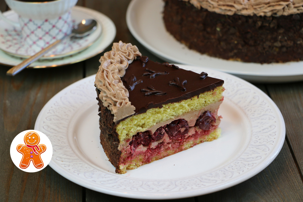 На первый корж выкладываем пропитанный крем и вишню, затем накрываем вторым коржом. Ставим торт в холодильник, чтобы крем стабилизировался. После охлаждения готовим глазурь из масла и шоколада, равномерно покрываем торт и украшаем оставшимся кремом.