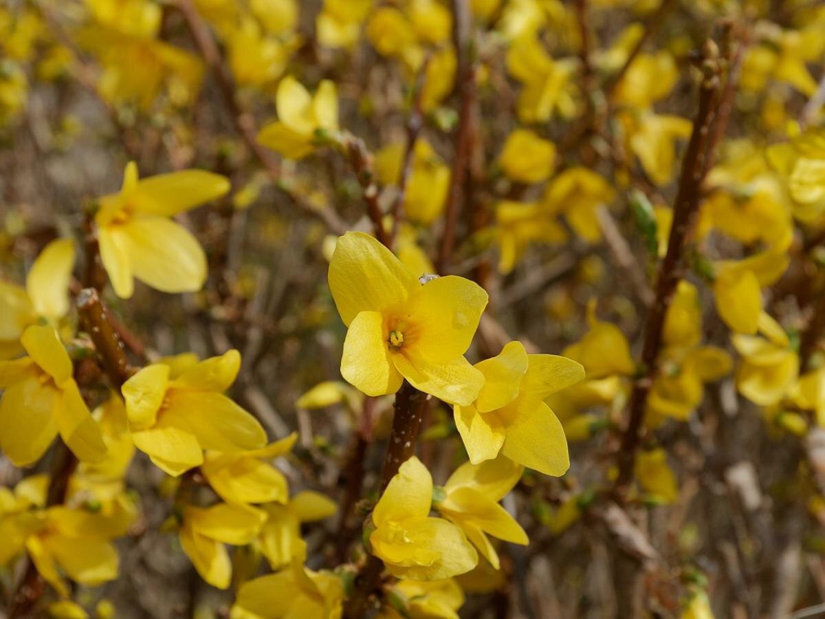 - Форзиция: цветение в апреле, высота 1-3 м, яркие кусты, подходит для живых изгородей.