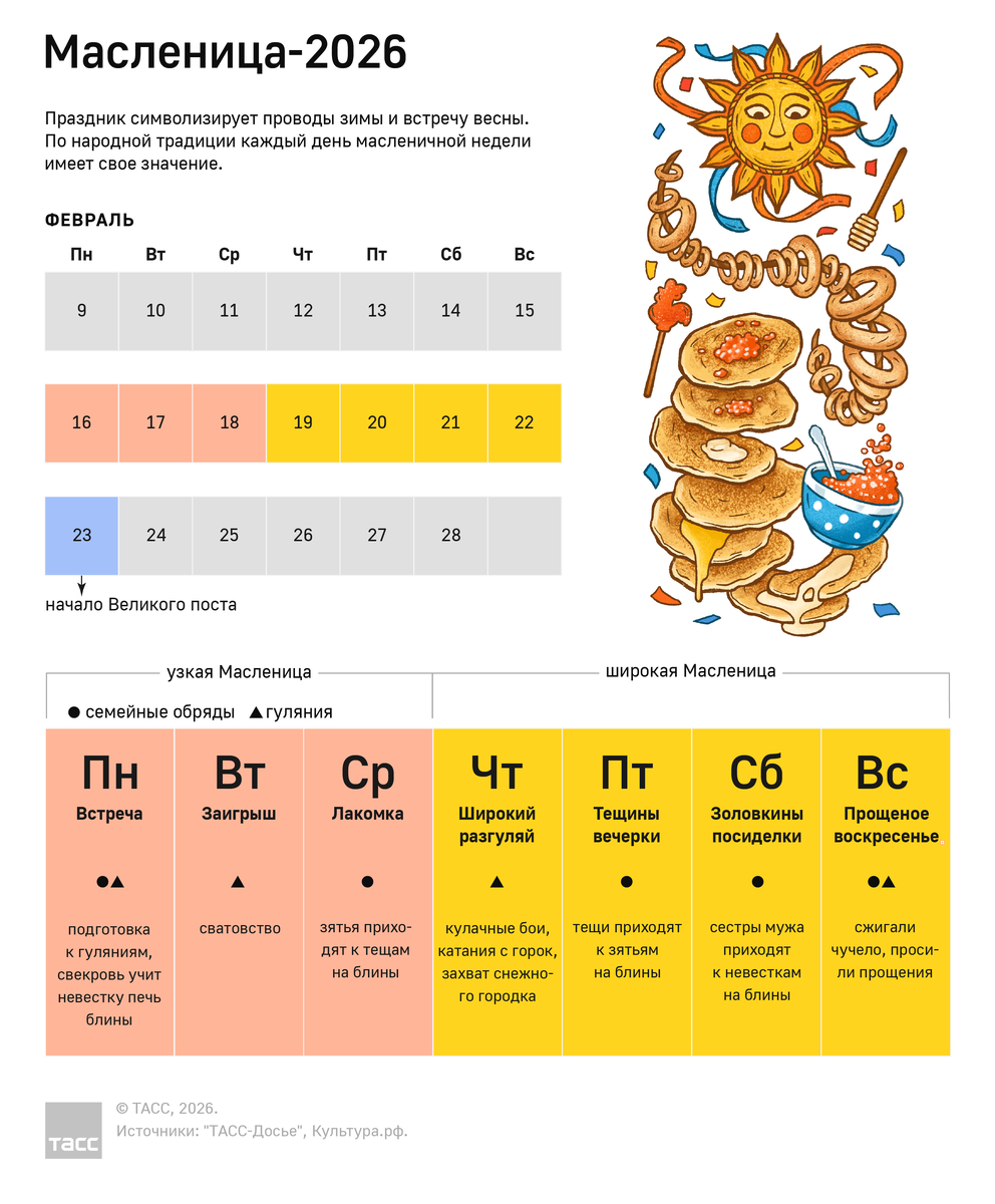 Каждый день Масленичной недели отмечен своими традициями и обычаями, которые делают празднование разнообразным и насыщенным. Например, понедельник часто становится днем для подготовки блинов, а выходные — для веселых застолий и общих гуляний. Подробно о каждом дне и его значении можно ознакомиться в инфографике ТАСС.