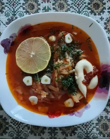 После выключения плиты дайте борщу настояться под крышкой. При подаче добавьте в каждую тарелку немного мелко нарезанного чеснока, свежего укропа и ломтик лимона. Для остроты можно предложить абхазскую аджику или молотый красный перец. Если желаете, добавьте немного сметаны или майонеза. Этот борщ не только порадует своим вкусом, но и придаст вашему рациону свежие ноты.