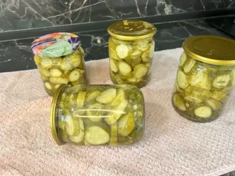 4. В каждую баночку уложите огурцы, нарезанные кружками, плотно их укладывая. Затем добавьте по одной teaspoon уксуса и залейте все кипящим маринадом. На этом этапе банки не закрываются, а стерилизуются около 10 минут.