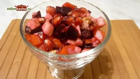 Теперь следует нарезать свеклу и морковь кубиками, а яблоко можно порезать или натереть на терке — так салат получится более нежным. Лук нарезается мелко. Орехи можно измельчить в крошку. Все продукты кладутся в салатницу, при этом добавляются зерна граната.