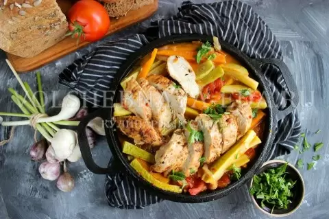 Приготовление блюда начинается с обжаривания куриного филе на сковороде или в сотейнике. По мере того как курица подрумянивается, на оставшемся после жарки масле начинают готовиться овощи. Весь процесс займет не более получаса! В итоге получится нежное куриное мясо, идеально сочетающееся с молодыми кабачками.