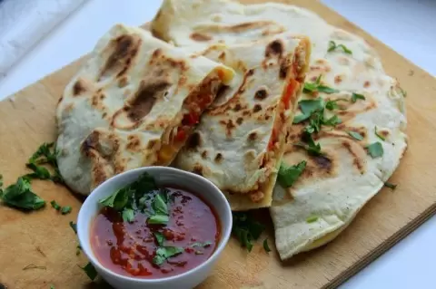 Кесадильи готовы к подаче и отлично сочетаются с острым томатным соусом. Приятного аппетита!