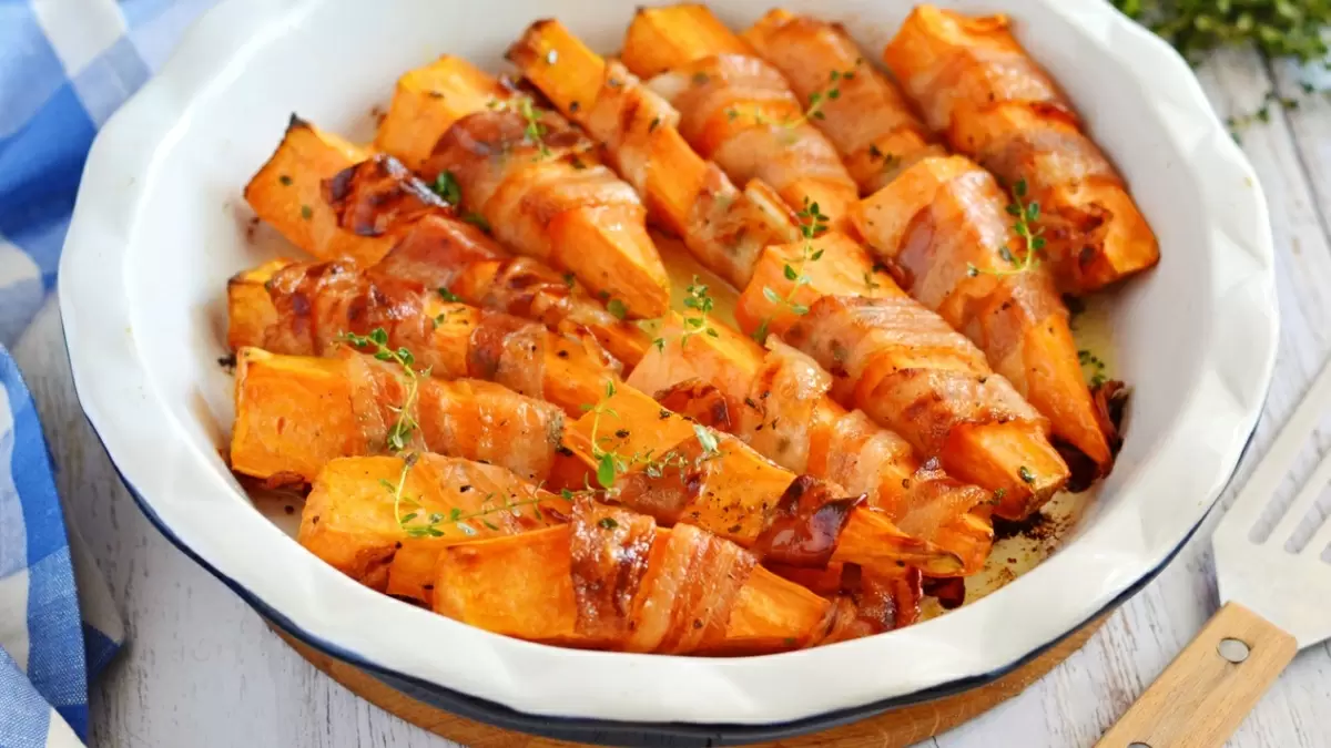 Запекайте в течение 20-25 минут, пока бекон не станет золотистым, а батат не станет мягким, как запеченный картофель. Результат обязательно порадует вас вкусом и ароматом.