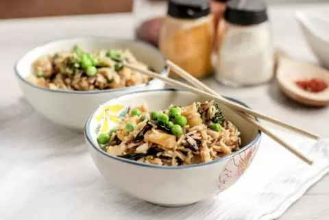 Шаг 3: Разогрейте сковороду с одной столовой ложкой растительного масла. Обжарьте лук и имбирь в течение 2-3 минут, затем добавьте ананасы, горошек, брокколи, перец, кориандр, паприку и лимонную цедру. Обжаривайте все это в течение 5 минут. Влейте соевый соус и кунжутное масло, перемешайте, а затем добавьте отварной рис и готовьте еще 3-4 минуты. При необходимости поправьте по вкусу соль и добавьте нарезанные листы нори. Подавайте горячим и наслаждайтесь удивительным сочетанием!