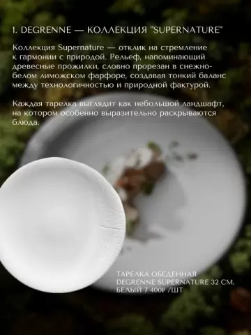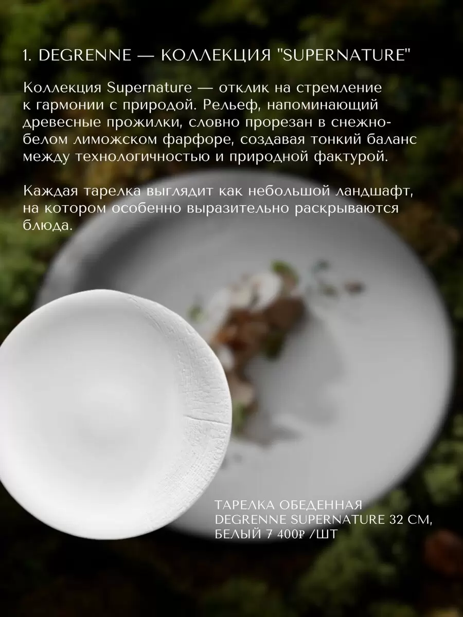 - Supernature, Degrenne — белый лиможский фарфор с рельефом, похожим на древесные прожилки. Обеденная тарелка диаметром 32 см стоит 7 400? за штуку.