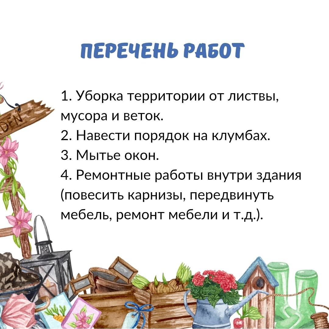 1. Уборка территории от листвы, мусора и веток.