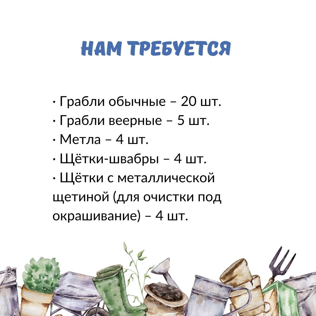 Для уборки и облагораживания территории требуется следующий инвентарь: