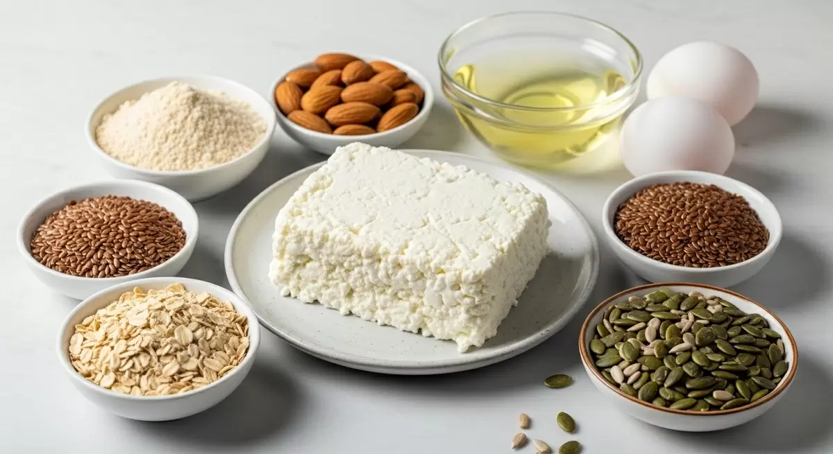 В глубокой миске следует объединить все сухие компоненты: измельченные орехи и семена, цельнозерновую муку и разрыхлитель. Затем добавляют творог и белки. Если творог слишком крупнозернистый, можно взбить его блендером вместе с белками, чтобы добиться более однородной текстуры и нежности хлеба.