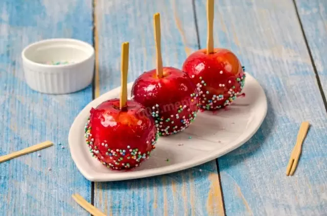 На подготовленную плоскую тарелку нанесите легкий слой растительного масла, чтобы яблоки не прилипли. Затем приготовьте миску с кондитерской посыпкой. Окуните яблоко за палочку в теплую карамель, поворачивая его. Если карамели недостаточно, слегка наклоните кастрюлю.