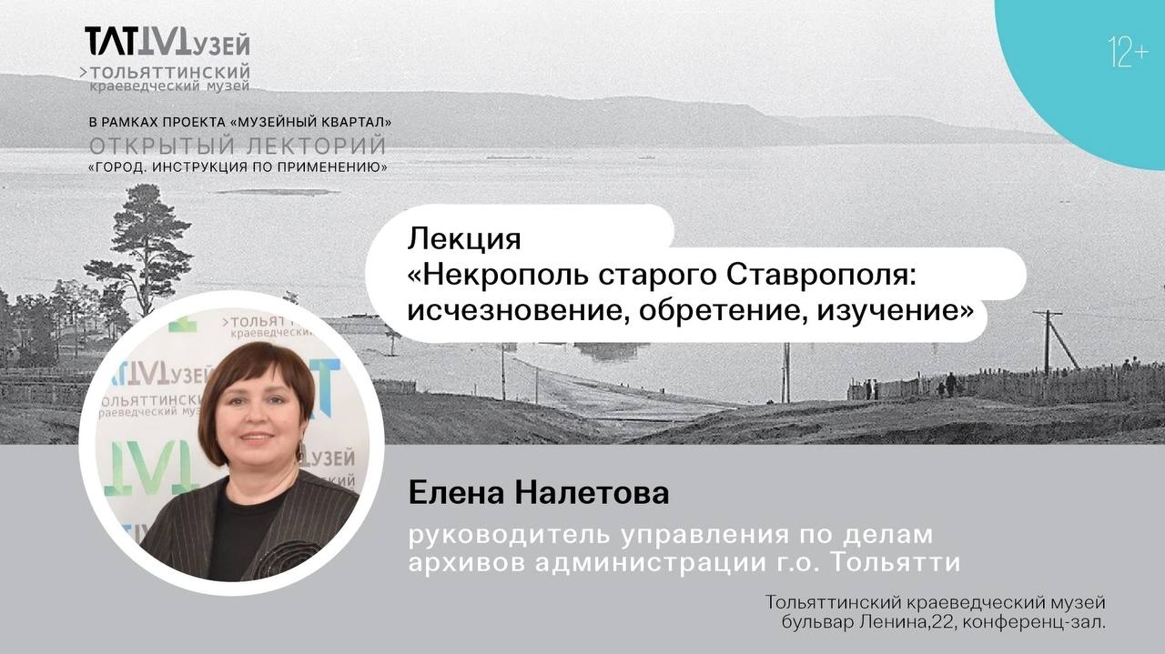 Лектор - Елена Налётова, кандидат педагогических наук, руководитель управления по делам архивов администрации г.о. Тольятти, организатор работ расскажет о немногочисленных известных на сегодняшний день фактах о кладбищах Ставрополя и их судьбе в связи с переносом города на новое место. Центральной темой повествования станет рассказ об охранно-спасательных археологических работах на некрополе старого Ставрополя в начале ХХI века.