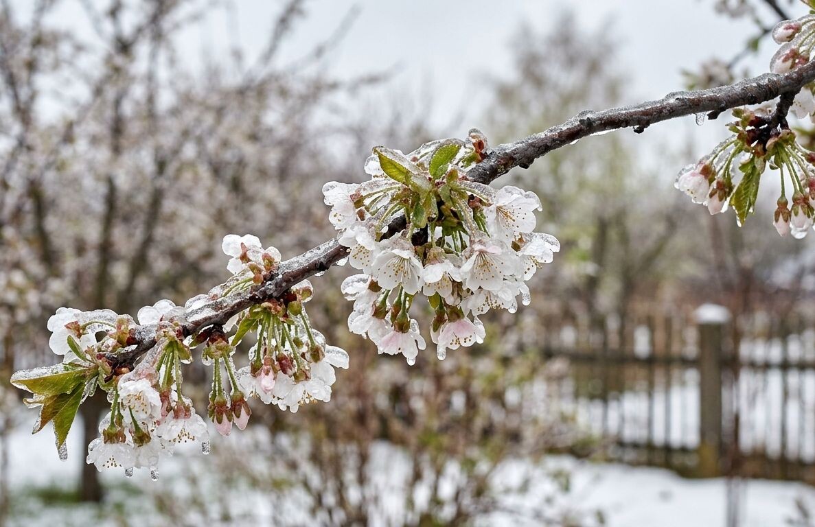 - Ледяная корка. Звучит странно, но полив цветущих веток ледяной коркой может спасти растения. Вода, замерзая, выделяет тепло, защищая нежные цветы от мороза. Главное — не прекращать полив до тех пор, пока лёд не растает.