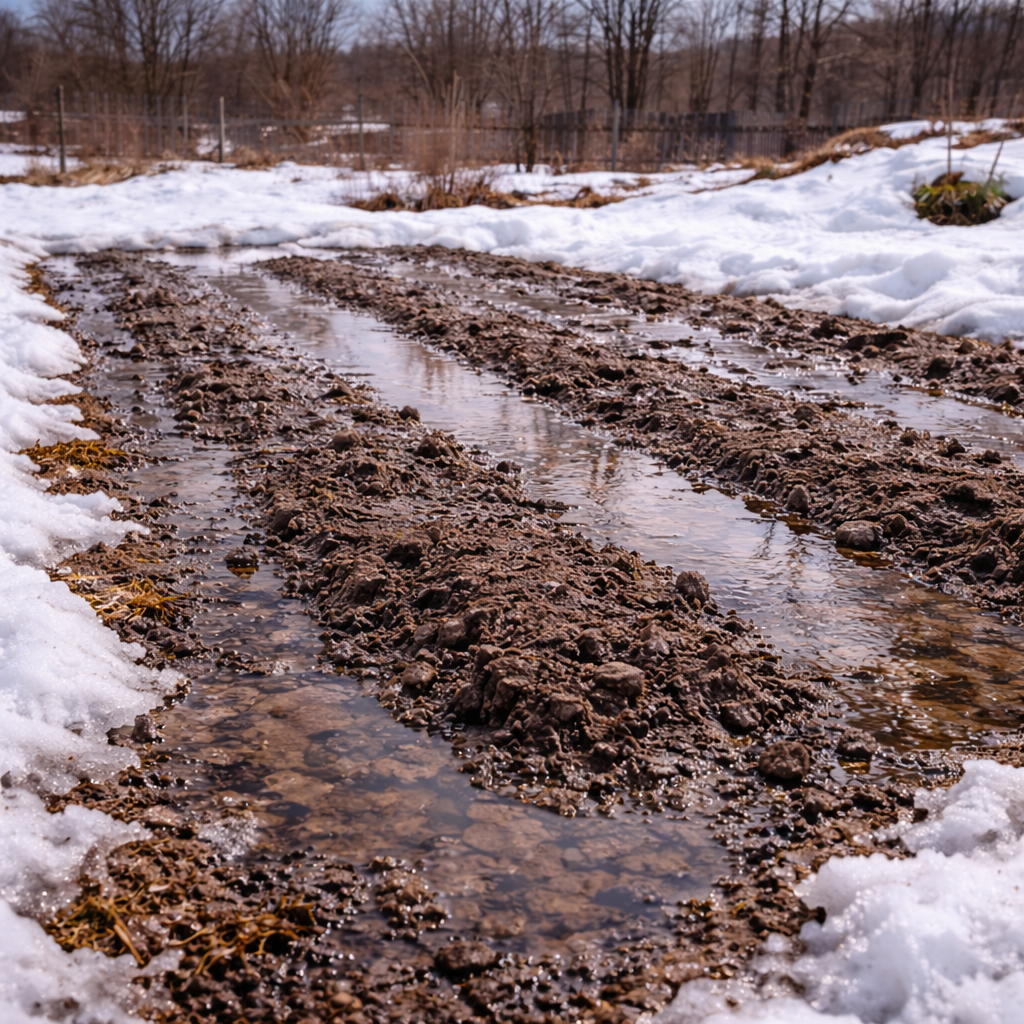 Если оттепель затягивается, влага накапливается в почве и внутренние слои становятся насыщенными водой, лишаясь кислорода. В этот момент почва наиболее уязвима. Любое дополнительное давление — будь то шаги или действия техники — может привести к заметному уплотнению.